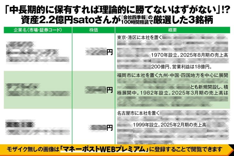 >プレミアム登録して、資産2.2億円のsatoさんが四季報100時間精読で厳選したバリュー株3銘柄の一覧表を見る【初回登録月は無料】