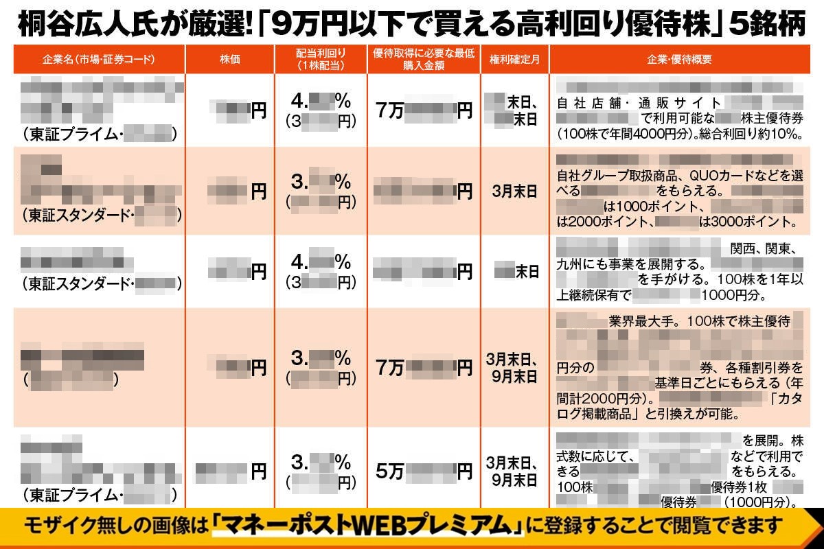 >桐谷さん厳選「9万円以下で買える高利回り優待株」5銘柄の表と解説を読む【初回登録月は無料】