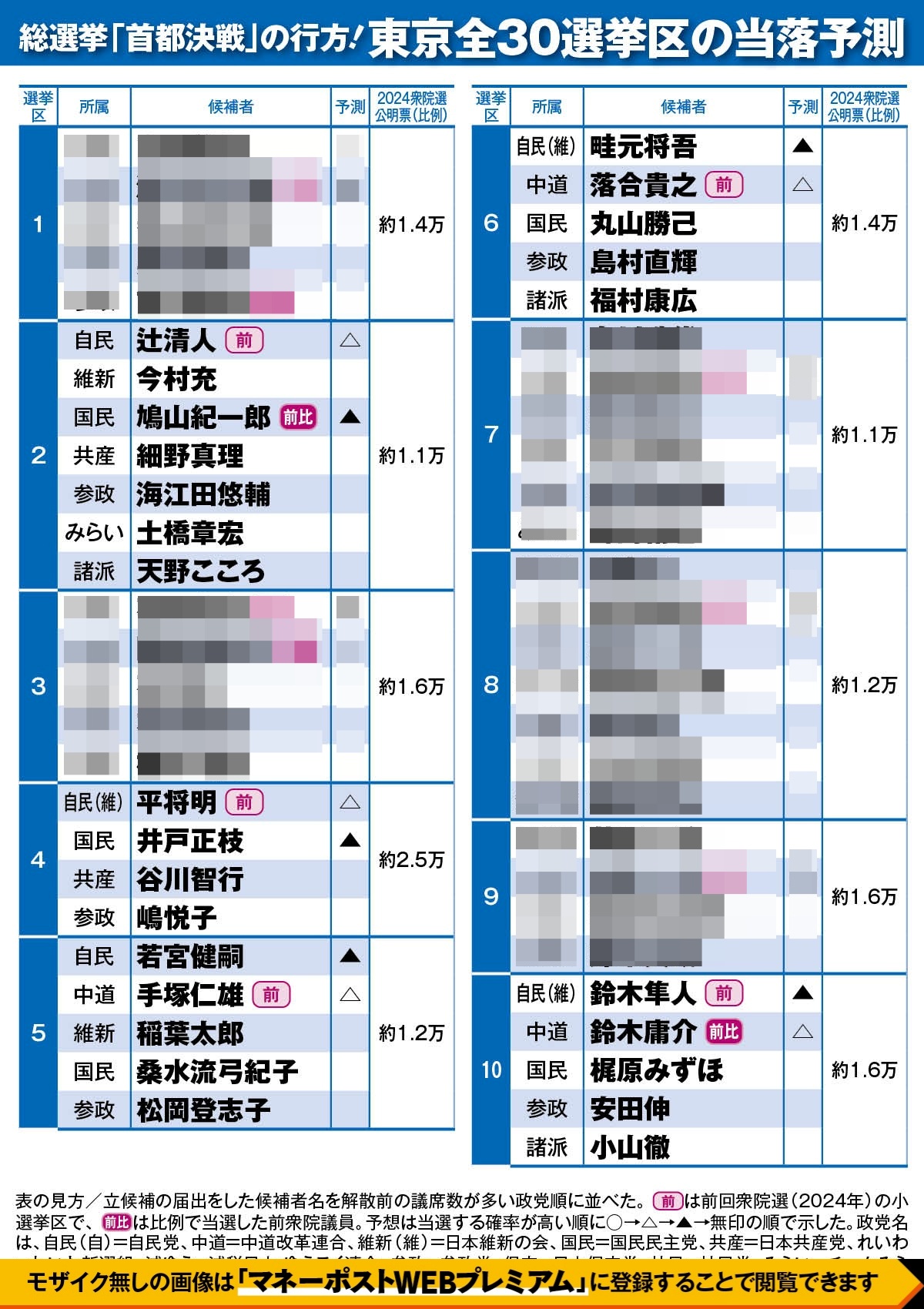 【マネーポストWEBプレミアムへの登録・ログイン後は下にスクロールするとモザイクなしの画像、東京都の全選挙区「候補者・当落予想印」が見られます】