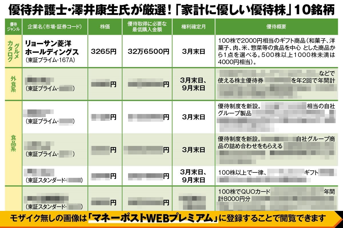 そんな澤井氏に、株主優待を新設した銘柄をはじめ、グルメカタログ、高額QUOカード、クレジットカード会社発行ギフトカード、食品現物がもらえる銘柄など、いま注目する「家計を助ける優待株」を10銘柄挙げてもらった。