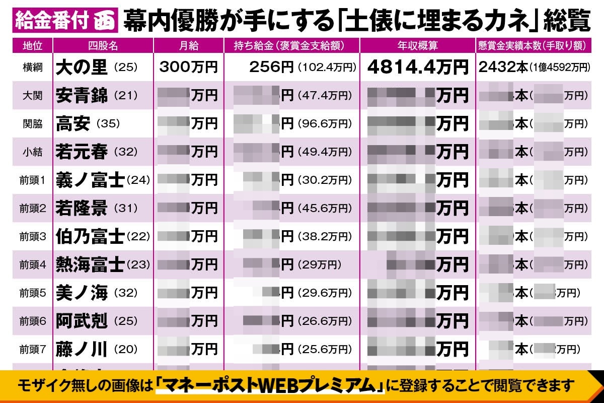 《大相撲「給金番付」公開》幕内全力士の年収概算総覧 安青錦よりも「持ち給金」が多い力士が多数いる理由とは 力士褒賞金が「元大関」たちにとっての安定した収入源に